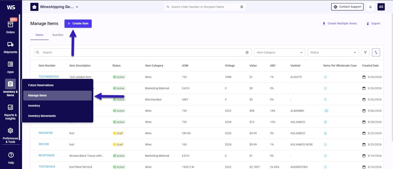 Inventory & Items → Manage Items