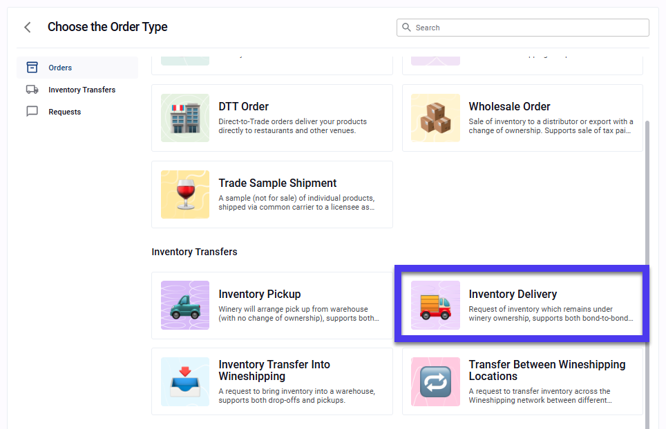 Use Inventory Delivery to identify inventory you would like Wineshipping to deliver to another location.