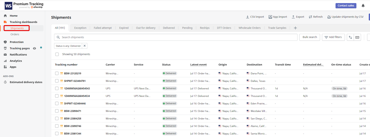 To print a Proof of Delivery, begin by navigating to the ‘Shipments’ section within Premium Tracking.