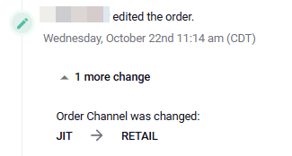 This log appears when you change the order channel on an order (e.g., from JIT to Retail, Retail to Club, etc.).