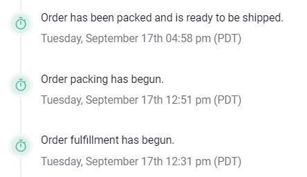 Each event shows when the order was released, when work began on the order, and when the package was labeled.