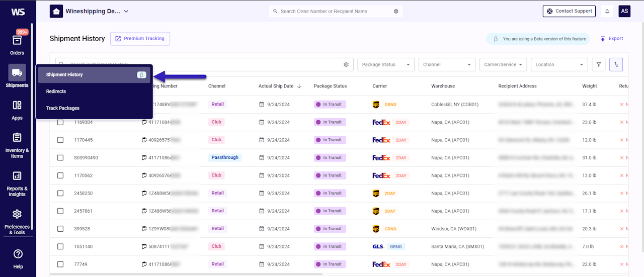 Shipment History page, located in the Shipments tile, will provide you with information on your package once Wineshipping hands the package over to carrier.