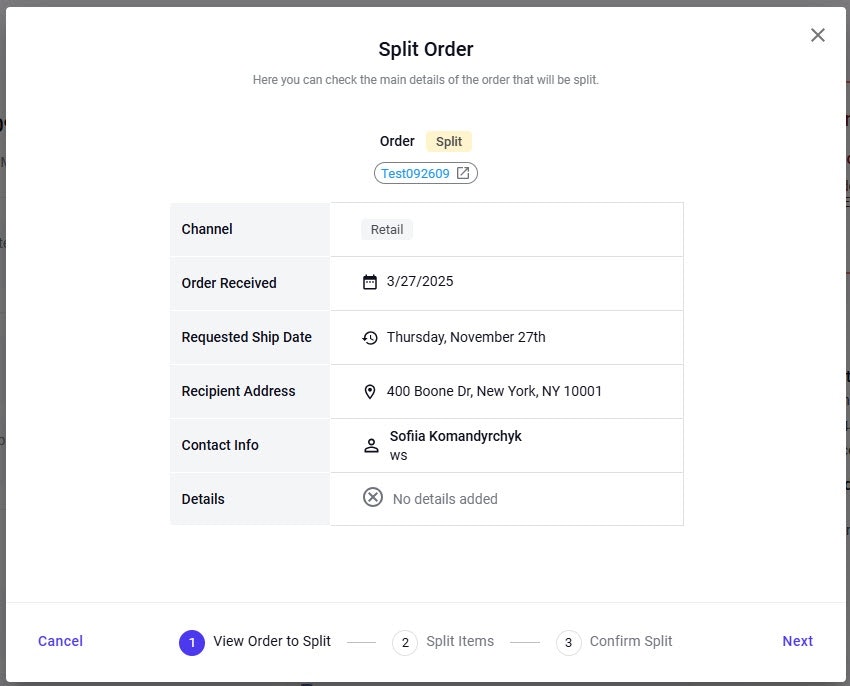 Orders in active warehouse processing or shipped statuses cannot be split.