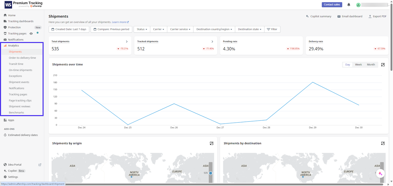 The Analytics section in Premium Tracking provides detailed insights into how your shipments are performing once they leave the warehouse. These reports help you understand carrier performance, delivery trends, transit times, and exceptions, giving you visibility into what is happening across your shipping network.