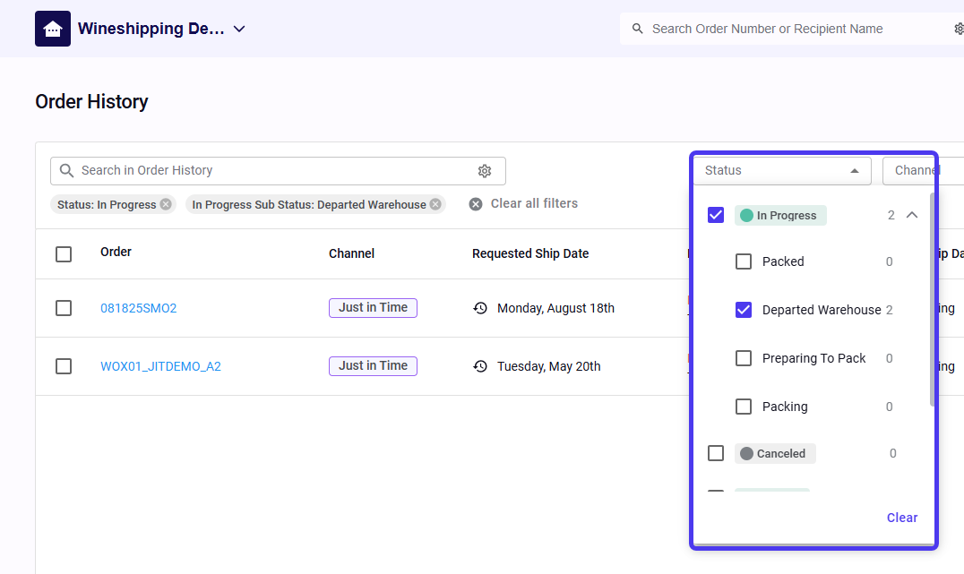 Shipping statuses are displayed based on: