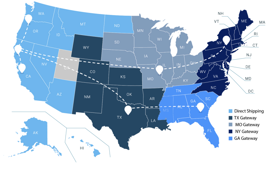 Strategic Hub Locations: Shipments travel to four key hub locations—Missouri (MO), New York (NY), Texas (TX), and Georgia (GA)—ensuring reliable protection across the country.